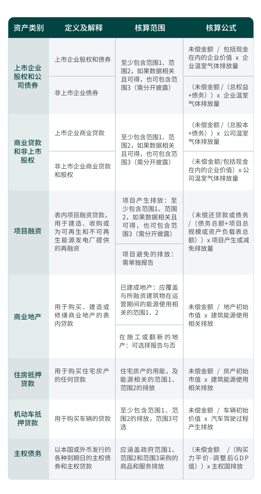 PCAF standards cover seven asset categories, each with specific accounting methods (the core idea being "investment share × carbon emissions of the target").