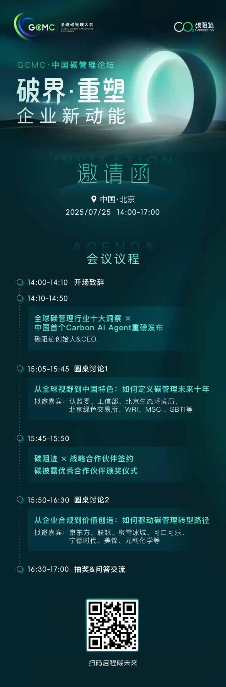 To help enterprises better seize this green transformation opportunity and achieve an efficient leap towards low-carbon development, Carbonstop will host the GCMC China Carbon Management Forum in Beijing on the afternoon of July 25th, themed "Breaking Boundaries, Reshaping New Enterprise Momentum," gathering representatives from authoritative government organizations, internationally renowned institutions, and leading industry enterprises to jointly explore how digitalization and intelligence can drive low-carbon transformation.
